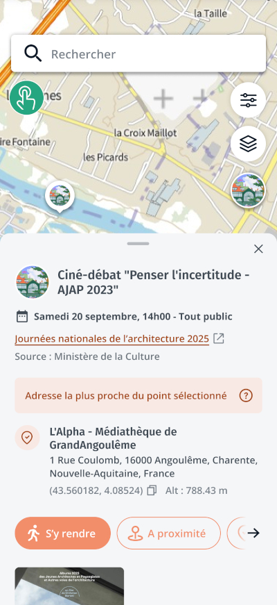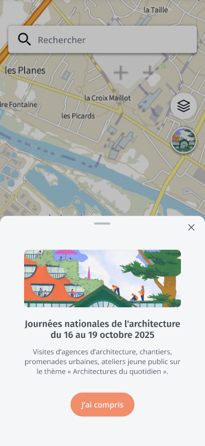 Retrouvez simplement toute la programmation des Journées nationales de l’architecture sur l’application Cartes IGN ! Depuis l’écran d’accueil, 1200 événements géolocalisés sont ainsi accessibles avec leur fiche détaillée : nom, photo, adresse, description, lien ou coordonnées de la billetterie.