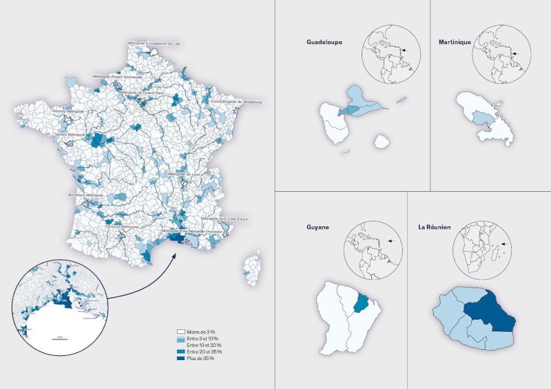 Cartes représentant la part de la population, par Établissements publics de coopération intercommunal (EPCI), vivant dans une zone à risque d’inondation, que ce soit par débordement de cours d’eau, par ruissellement ou par submersion marine. Elles s’appuient sur un scénario de probabilité moyenne utilisé comme référence dans les Plans de prévention des risques d’inondation (PPRI). © IGN
