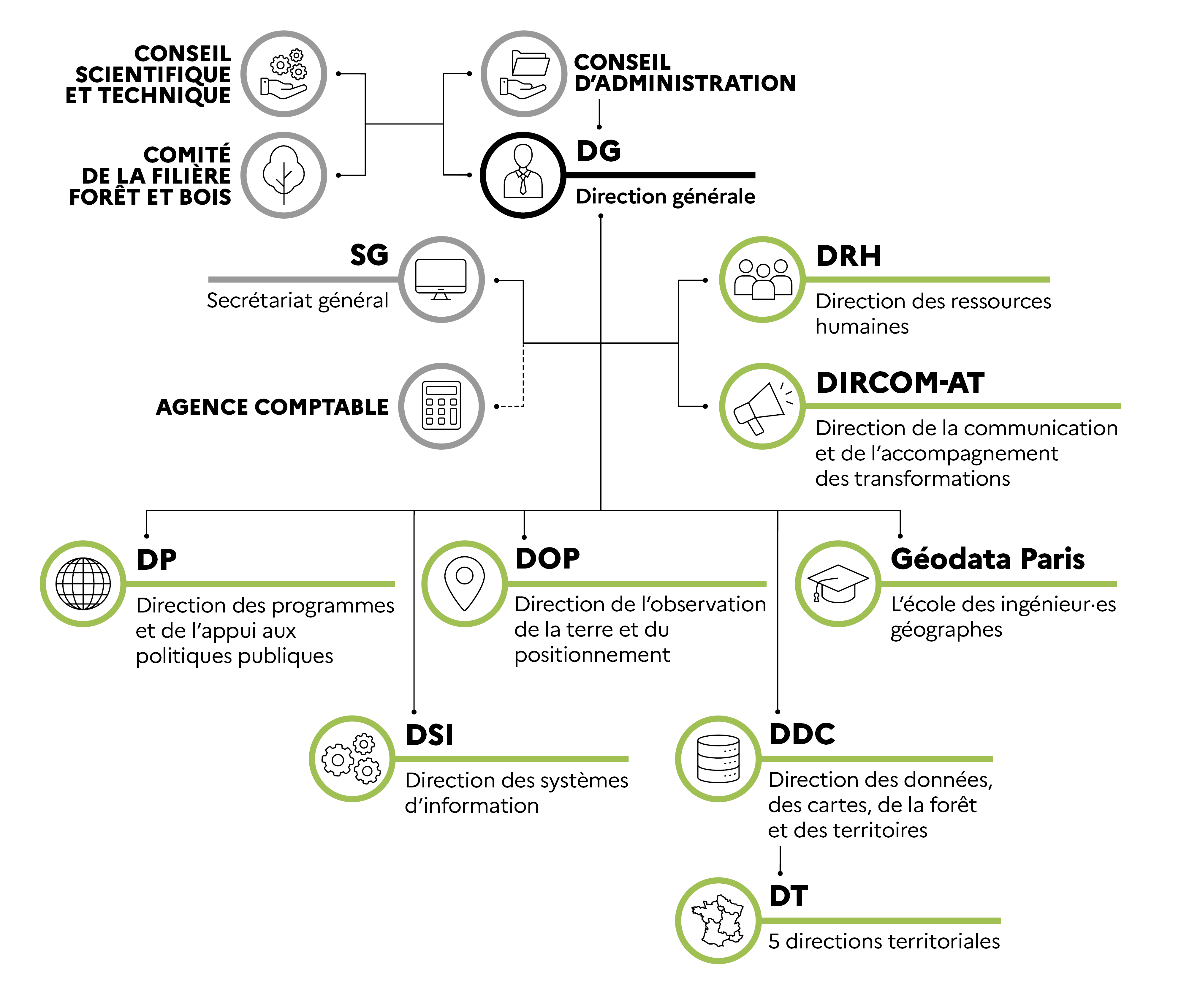 L’IGN est administré par un conseil d’administration et dirigé par un directeur général. Le conseil scientifique et technique, le comité de la filière forêt et bois, et le conseil de perfectionnement de l’école Géodata Paris assistent le conseil d’administration et le directeur général dans les domaines relevant de leurs compétences.