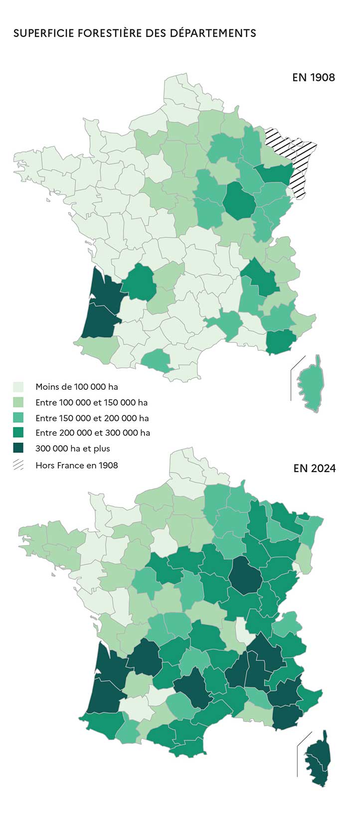 Évolution de la superficie forestière des départements entre 1908 et 2024