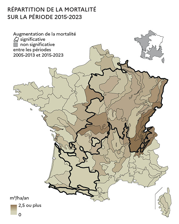 C’est l’un des constats les plus marquants de la dernière campagne d’inventaire qui vient confirmer une tendance observée depuis plusieurs années : la mortalité des arbres a plus que doublé en dix ans. Entre 2015 et 2023, elle atteint 16,7 millions de mètres cubes de bois par an, soit une hausse de 125 % par rapport à la décennie précédente où elle s’élevait à 7,4 millions de mètres cubes de bois par an.