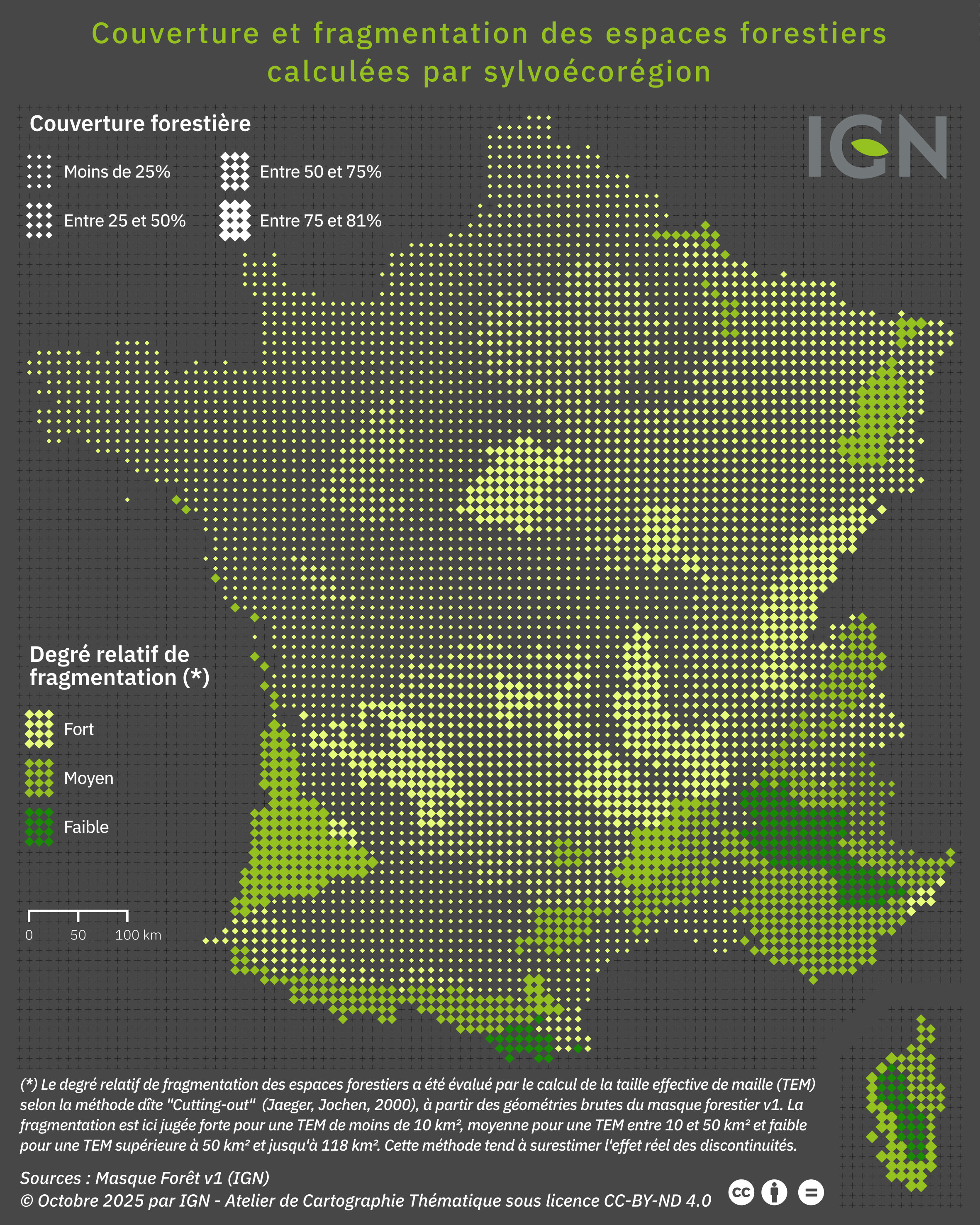 L’IGN illustre la fragmentation forestière à partir de ses dernières données sur la localisation des forêts françaises